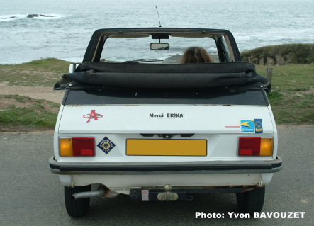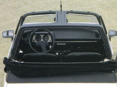 La modification consistait à implanter un arceau en forme de T reliant la baie de pare-brise et renforcé sur les côtés. Cet arceau recevait deux demi-coque en PVC tandis que l'arrière recevait une capote souple repliable manuellement, de couleur noire ou beige. On remarquera que le haut des montants de portière sont supprimés et le montage d'un autre montant pour rigidifier la vitre, celui-ci pourrait laisser croire qu'il y a un déflecteur alors qu'il n'y bien qu'une seule vitre! |