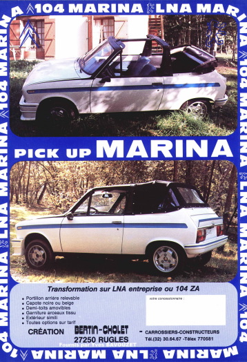 Les ateliers Bertin-cholet étaient situé à Neant Les Auvergny, près de Regles dans le département de l'Eure. Cette entreprise était spécialisée dans la transformation de véhicules utilitaires. C'est dans le début des années '80 que Bertin-Cholet proposait la transformation de LNA 652cc version entreprise en "pick-up" cabriolet sur base d'un véhicule neuf ou usagé. Bien que la marque aux chevrons n'en faisait pas la "publicité" cette transformation était bien agréée par celle-ci. |